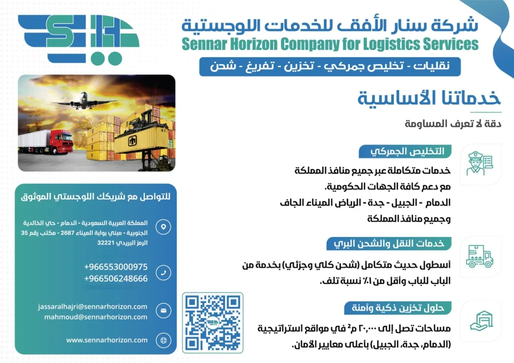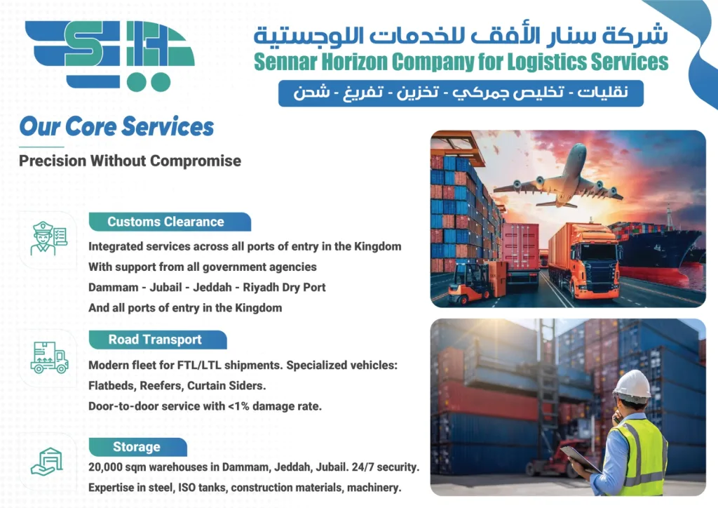 Customs Clearance (ZATCA/SABER ), Transport via a fleet of 150+ vehicles, and Warehousing in key cities like Dammam, Jeddah, and Jubail. Ensuring real-time tracking and secure storage. we are committed to “Precision Without Compromise,” delivering reliable, compliant, and efficient solutions to support your business growth.